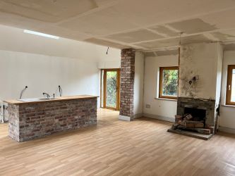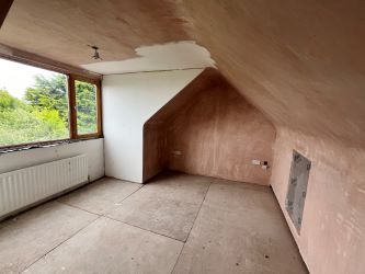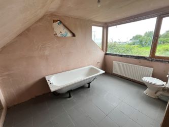 The property which has been vacant for some considerable time comprises large open-plan kitchen/living/dining room with open hearth fireplace and French doors to both front and rear. There are two further rooms downstairs and the unfinished staircase to the first floor. Upstairs there are two further dormer rooms, one of which has been partially plumbed for a bathroom.